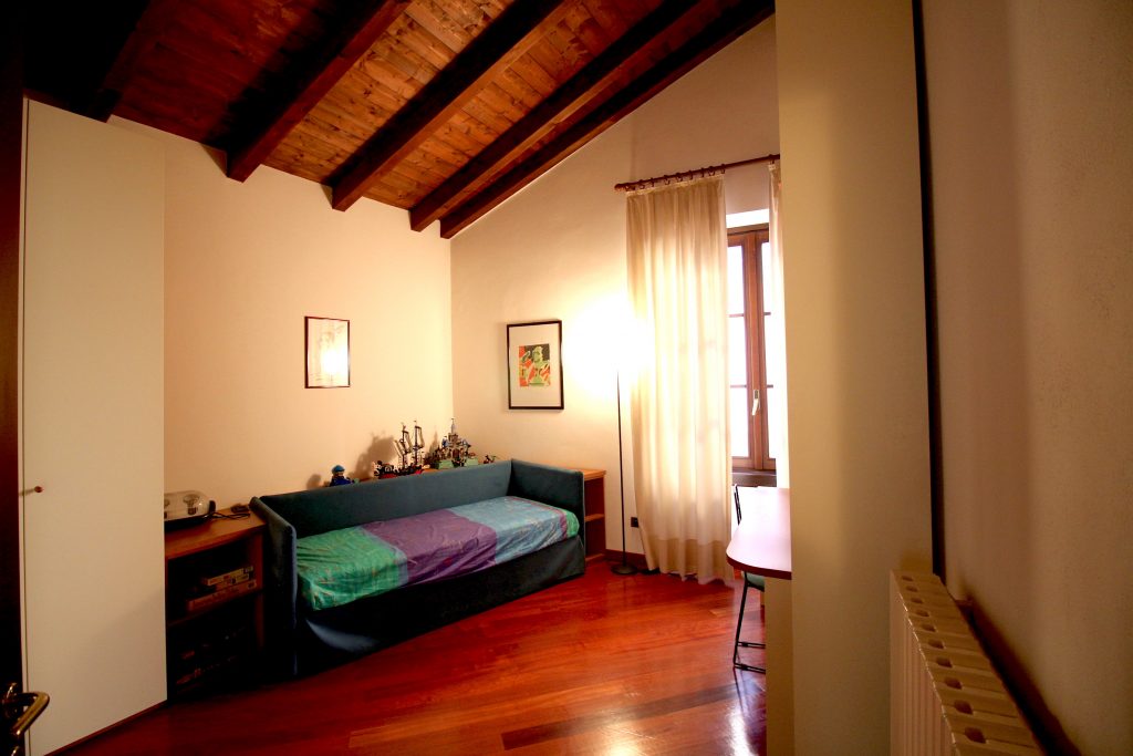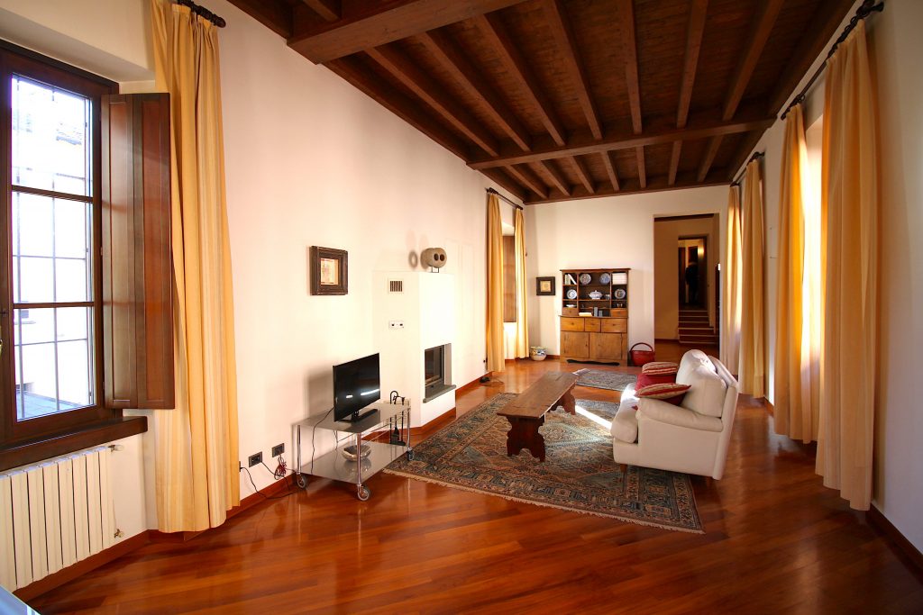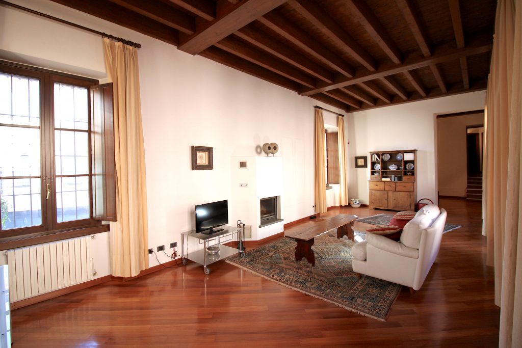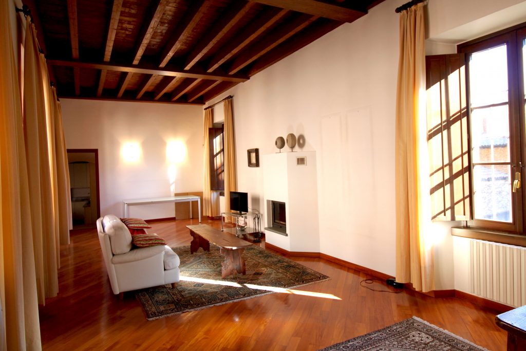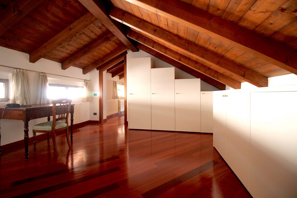 L’appartamento è così composto: ingresso al piano primo con ascensore, ampio salone con camino, cucina abitabile, tre camere da letto e due bagni; al piano secondo, disimpegno armadiato, studio, camera da letto matrimoniale con bagno en suite con vasca idromassaggio; al piano terreno, ingresso, disimpegno, bagno, salone, box di grandi dimensioni e locali tecnici. L’immobile presenta finiture di pregio, soffitti molto alti e affascinanti travi a vista.