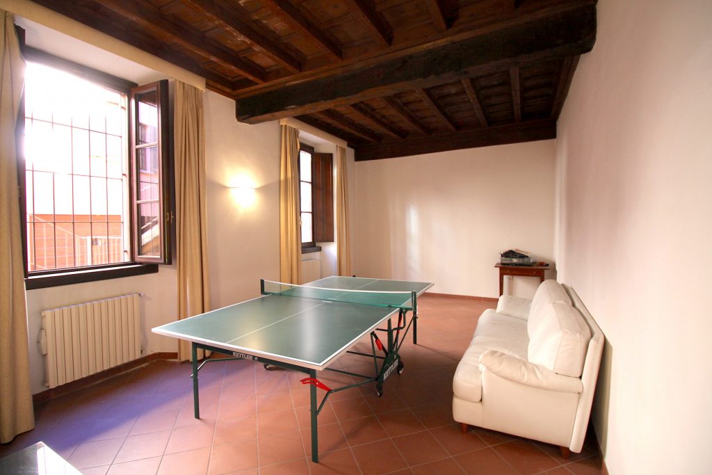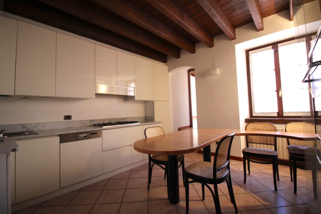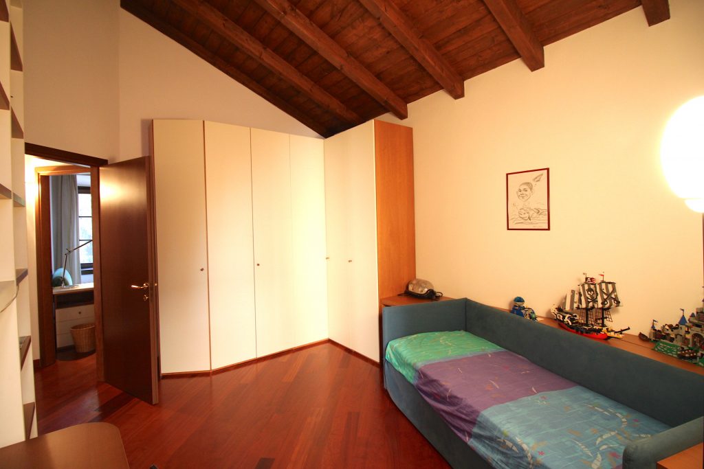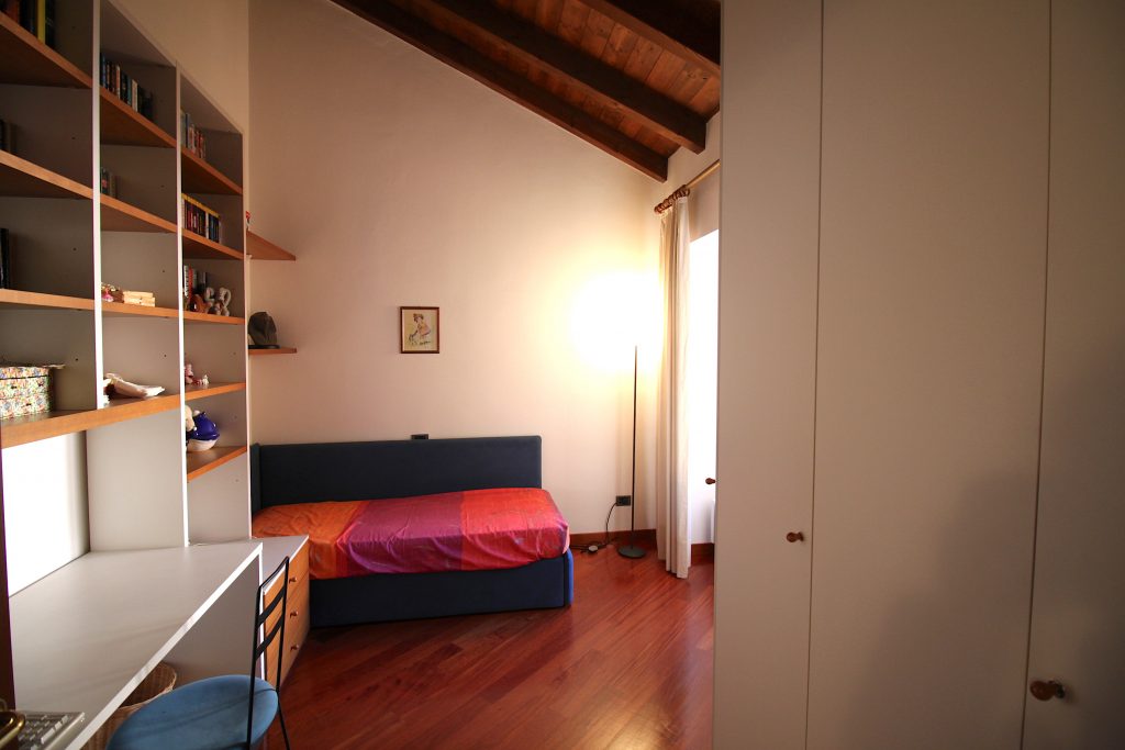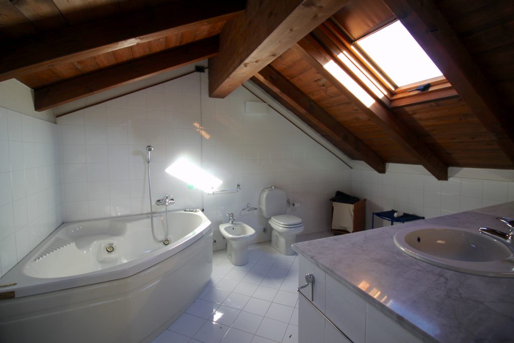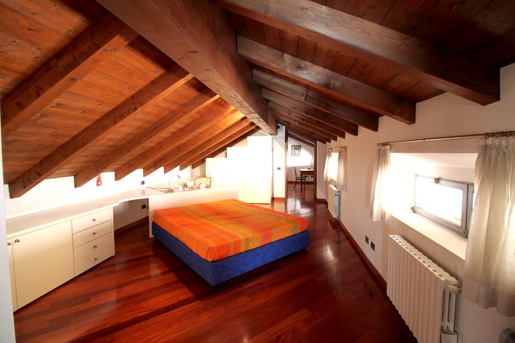 L’appartamento è così composto: ingresso al piano primo con ascensore, ampio salone con camino, cucina abitabile, tre camere da letto e due bagni; al piano secondo, disimpegno armadiato, studio, camera da letto matrimoniale con bagno en suite con vasca idromassaggio; al piano terreno, ingresso, disimpegno, bagno, salone, box di grandi dimensioni e locali tecnici. L’immobile presenta finiture di pregio, soffitti molto alti e affascinanti travi a vista.